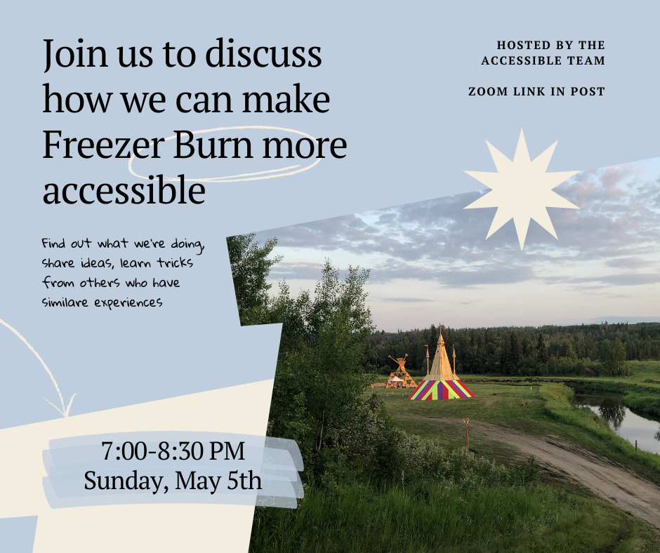 Please join us via zoom Sunday night for a sort of Town Hall meeting about accessibility at Freezer Burn.We would like to find out what accessibility concerns you may have and if you’ve come up with ideas to propose or things that have worked for you, we’d love to hear them!